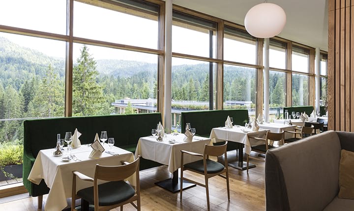 - Ausblick in den Wald durch große Panoramafenster
